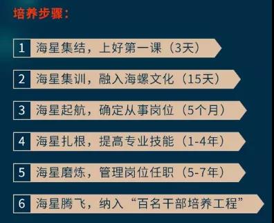 “海螺水泥明日之星培養(yǎng)計劃”,以每年各區(qū)域招聘引進(jìn)的高校畢業(yè)生為主,重點在國內(nèi)各區(qū)域子公司實施,以形成每個公司各專業(yè)至少培養(yǎng)儲備一名中層后備年輕人才為目標(biāo)。“海星計劃”培養(yǎng)對象,以當(dāng)年各區(qū)域統(tǒng)招高校應(yīng)屆本科畢業(yè)生為主。