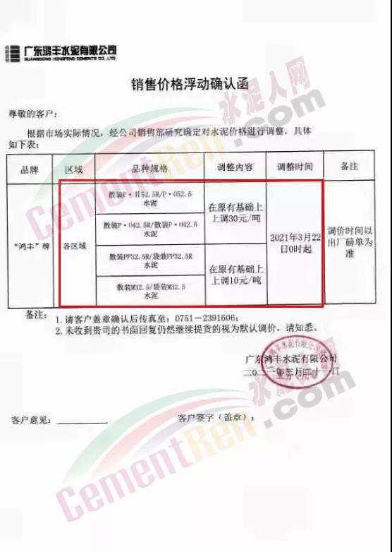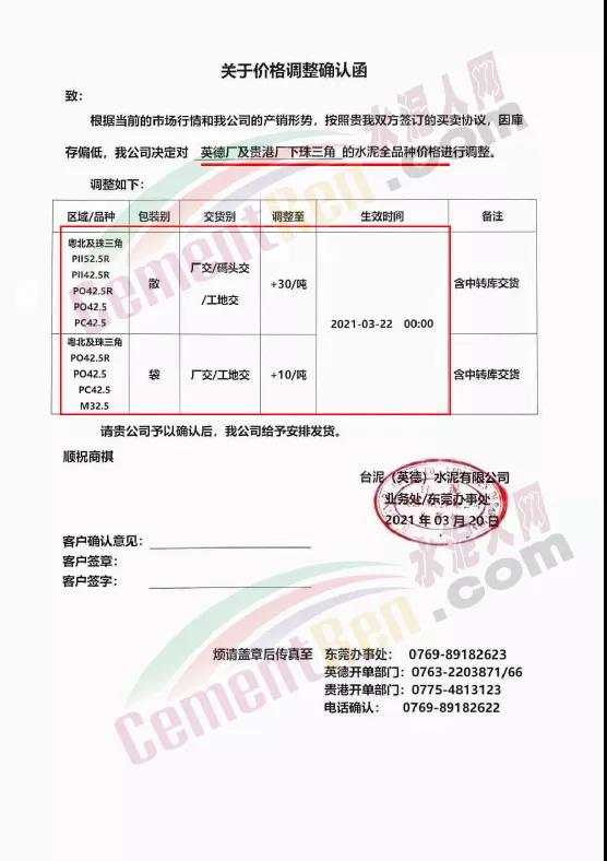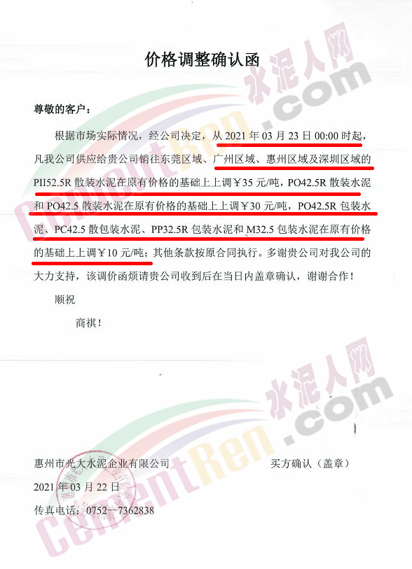 惠州市光大水泥通知,根據(jù)市場實際情況,經(jīng)公司決定,從2021年03月23日零時起,公司銷往東莞區(qū)域、廣州區(qū)域、惠州區(qū)域及深圳區(qū)域的 PII52.5R散裝水泥在原有價格的基礎(chǔ)上上調(diào)35元/噸,PO42.5R散裝水泥和PO42.5散裝水泥在原有價格的基礎(chǔ)上上調(diào)30元/噸,PO42.5R包裝水泥、PC42.5 散包裝水泥、PP32.5R包裝水泥和M32.5包裝水泥在原有價格的基礎(chǔ)上上調(diào)10元/噸;其他條款按原合同執(zhí)行。