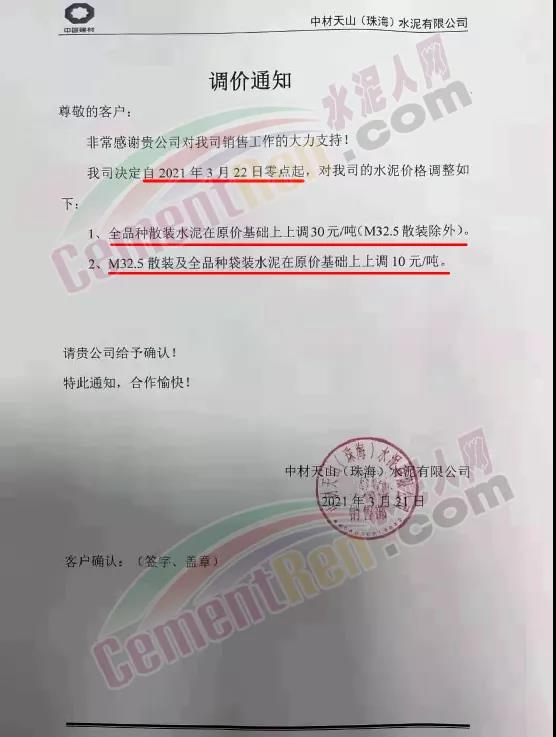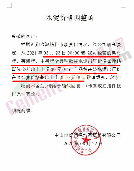 中山市好潤保水泥貿(mào)易有限公司通知,從2021年03月23日零時起,公司經(jīng)營的英材牌、英海牌、中粵牌全品種散裝水泥出廠價格在原結(jié)算價格基礎(chǔ)上上調(diào) 30元/噸;全品種袋裝水泥出廠價在原結(jié)算價格基礎(chǔ)上上調(diào) 10元/噸。