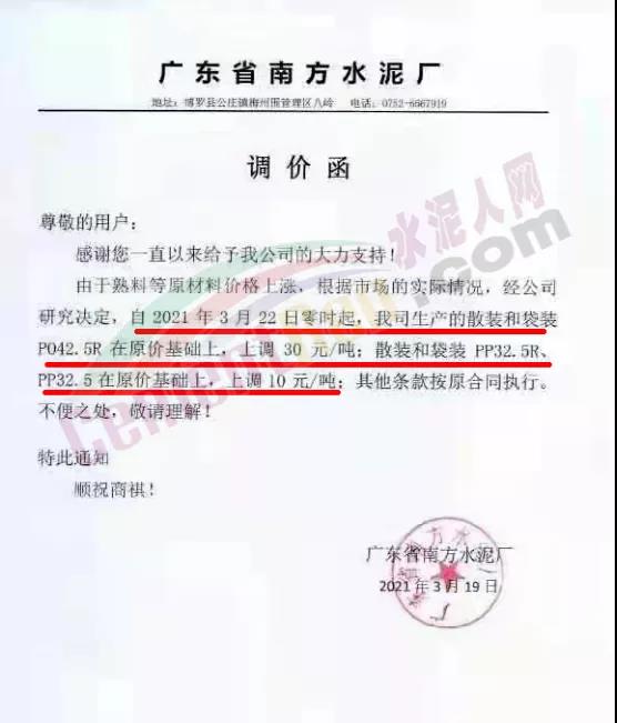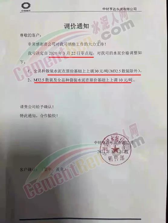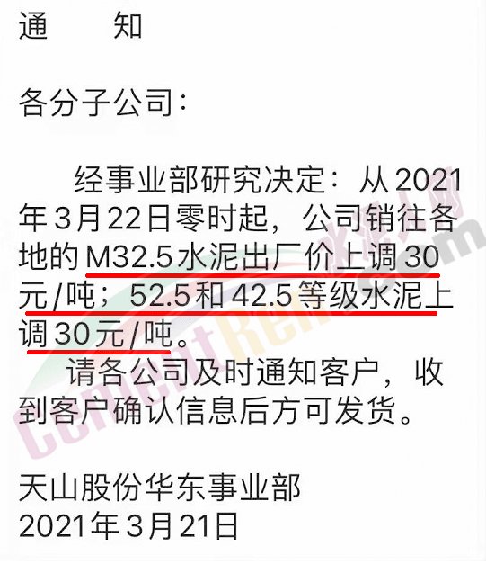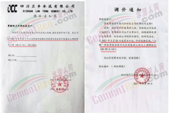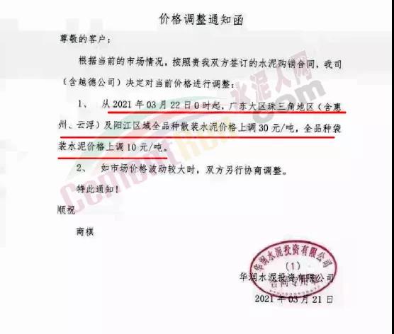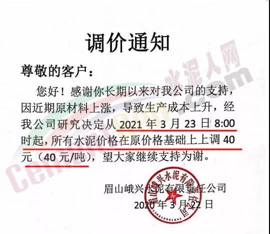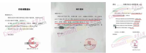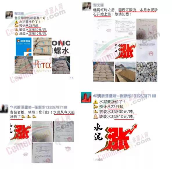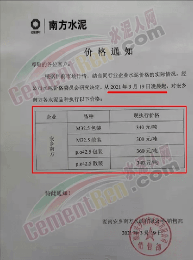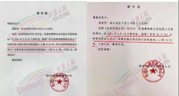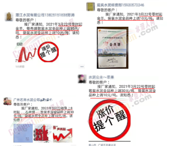 同時,下游經(jīng)銷商也集體發(fā)通知告知客戶水泥漲價的消息。