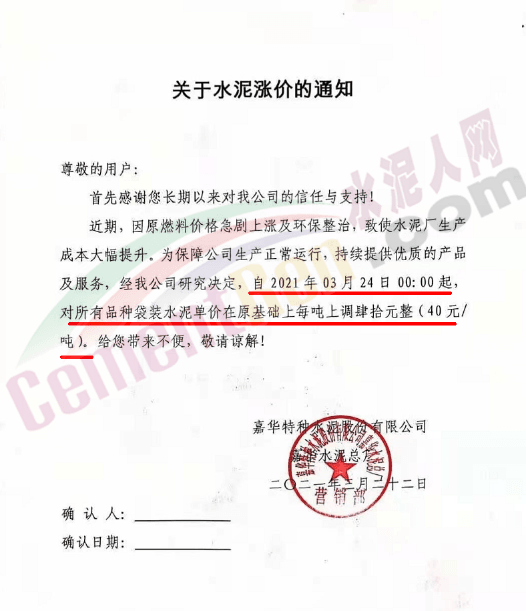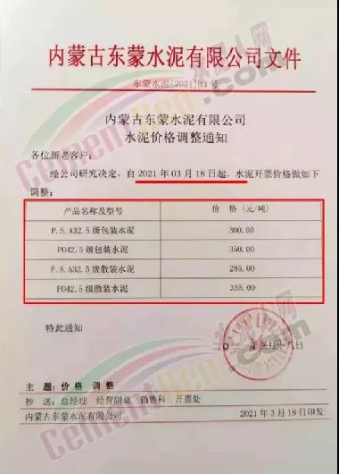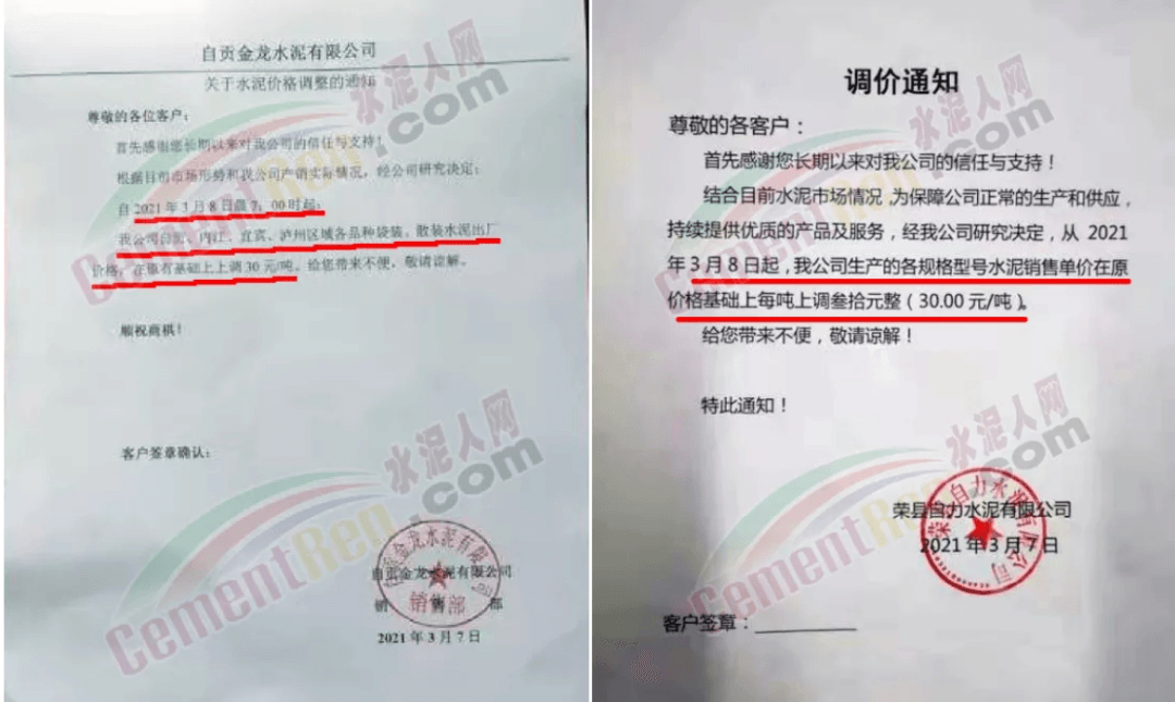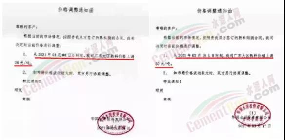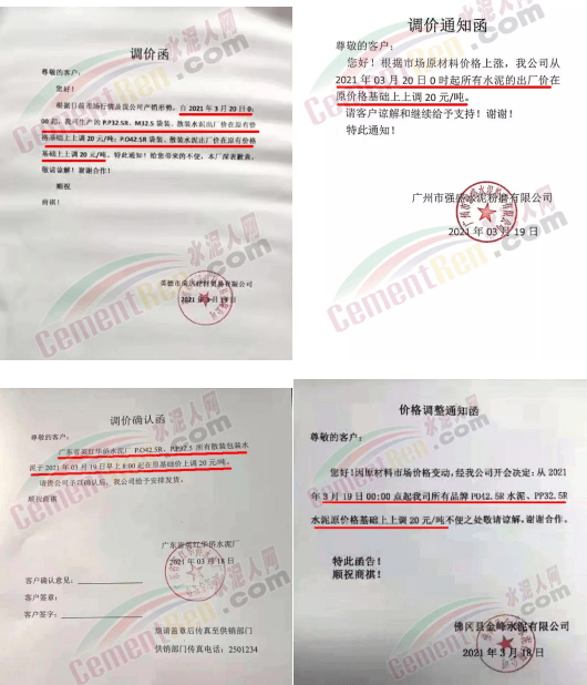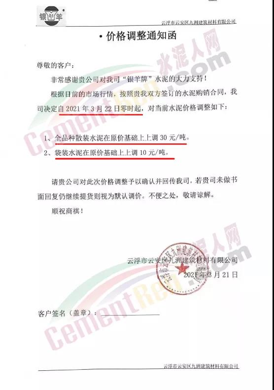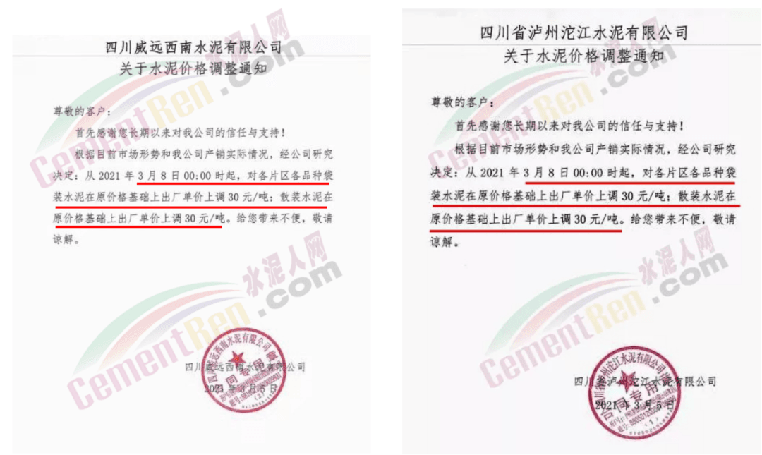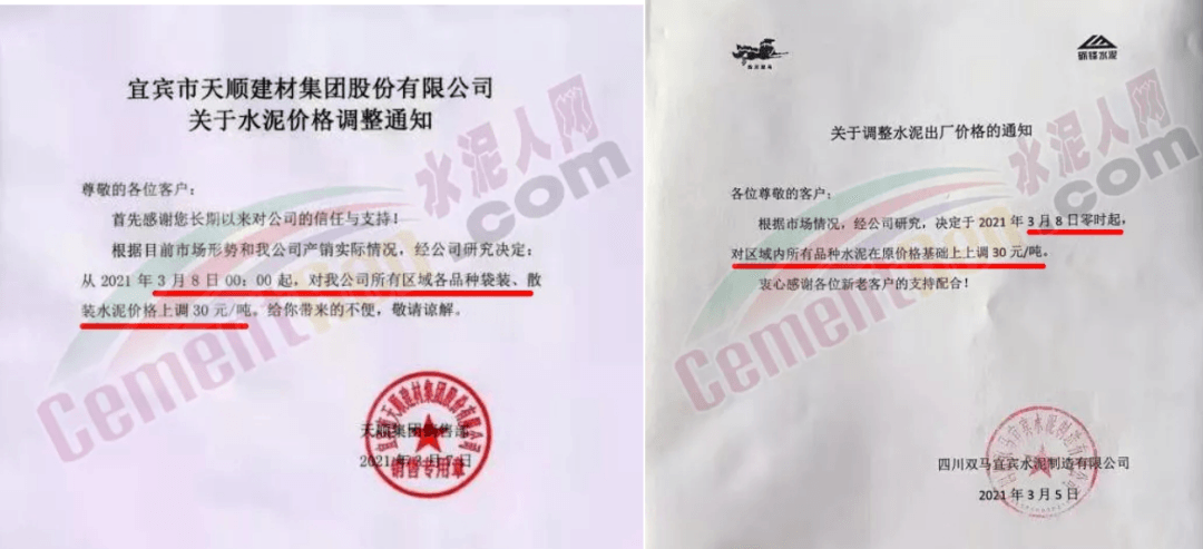 同時,下游經(jīng)銷商也集體發(fā)通知告知客戶水泥漲價的消息。