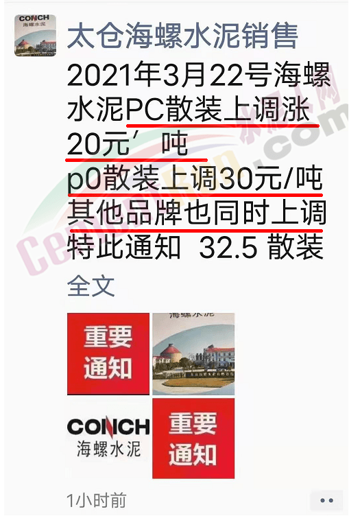 太倉海螺水泥通知自3月22日起海螺水泥PC散裝上調(diào)20元/噸,PO散裝上調(diào)30元/噸。