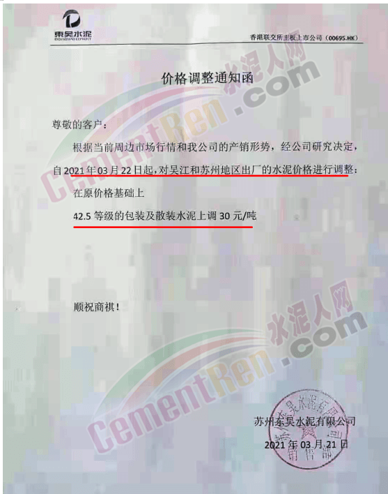 蘇州東吳水泥通知,3月22日起對吳江和蘇州地區(qū)出廠的水泥價格進行調(diào)整,42.5等級包裝及散裝水泥統(tǒng)一上調(diào)30元/噸。