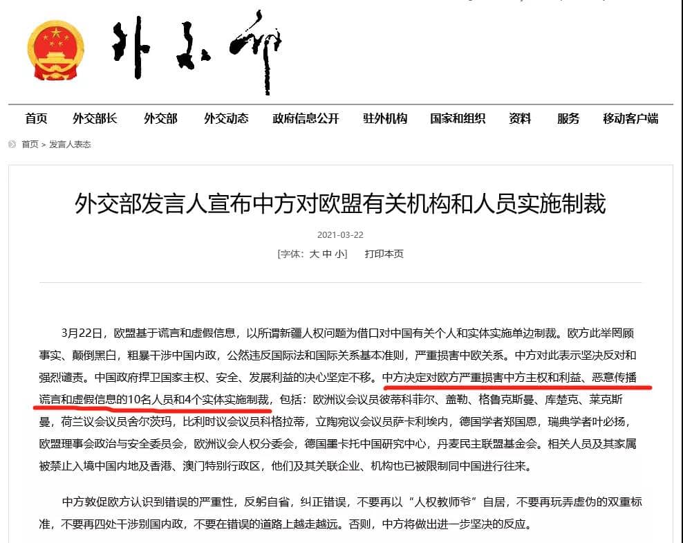 中方?jīng)Q定對歐方嚴(yán)重?fù)p害中方主權(quán)和利益、惡意傳播謊言和虛假信息的10名人員和4個實體實施制裁,包括:歐洲議會議員彼蒂科菲爾、蓋勒、格魯克斯曼、庫楚克、萊克斯曼,荷蘭議會議員舍爾茨瑪,比利時議會議員科格拉蒂,立陶宛議會議員薩卡利埃內(nèi),德國學(xué)者鄭國恩,瑞典學(xué)者葉必?fù)P,歐盟理事會政治與安全委員會,歐洲議會人權(quán)分委會,德國墨卡托中國研究中心,丹麥民主聯(lián)盟基金會。相關(guān)人員及其家屬被禁止入境中國內(nèi)地及香港、澳門特別行政區(qū),他們及其關(guān)聯(lián)企業(yè)、機構(gòu)也已被限制同中國進行往來。