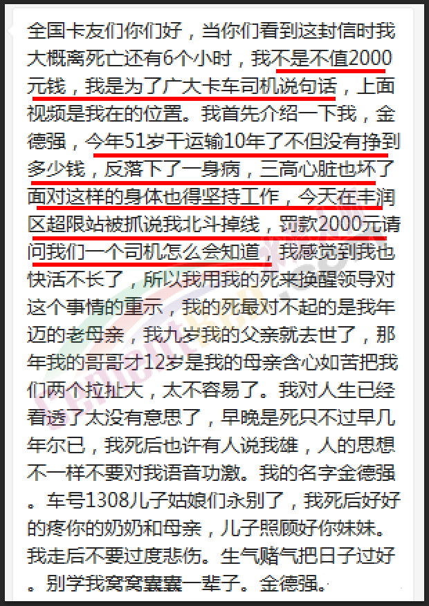 網(wǎng)傳的金德強(qiáng)臨走前留下的”遺言“在卡友群里瘋轉(zhuǎn),他在遺書中寫道,自己今年51歲,從事貨運(yùn)行業(yè)十年,沒賺到錢反而落下一身病,北斗掉線自己無法查知,希望用自己的死喚起領(lǐng)導(dǎo)對這個事情的重視。在他的字里行間能看得出這不是偶然的情緒崩潰,而是遇到了壓死他的最后一根稻草。