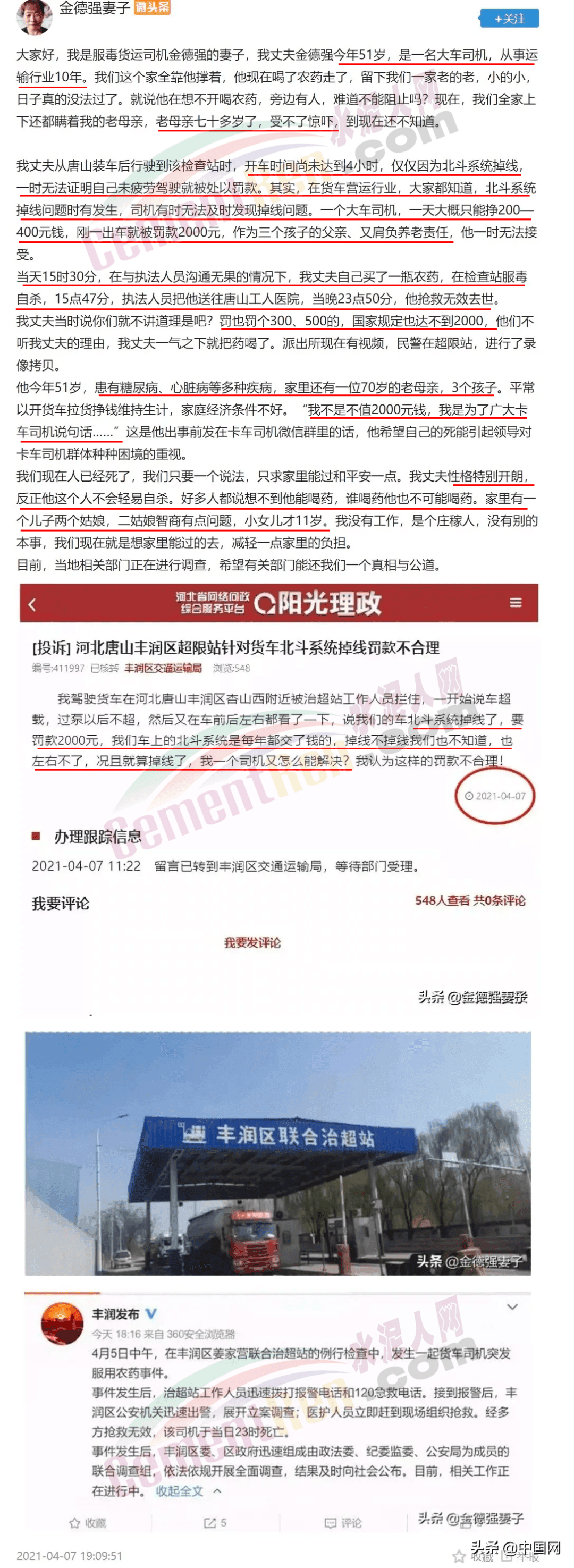 4月7日,服毒卡車司機(jī)金德強(qiáng)的妻子發(fā)聲:現(xiàn)在全家上下還都瞞著老母親,老母親七十多歲了,受不了驚嚇,到現(xiàn)在還不知道。目前,當(dāng)?shù)叵嚓P(guān)部門正在進(jìn)行調(diào)查,希望有關(guān)部門能還一個真相與公道。