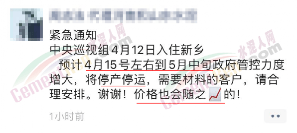 日前,有水泥經(jīng)銷商在社交平臺發(fā)布“緊急通知”稱,預(yù)計4月15日到5月中旬新鄉(xiāng)區(qū)域?qū)⑼.a(chǎn)停運,材料價格也會隨之上漲。