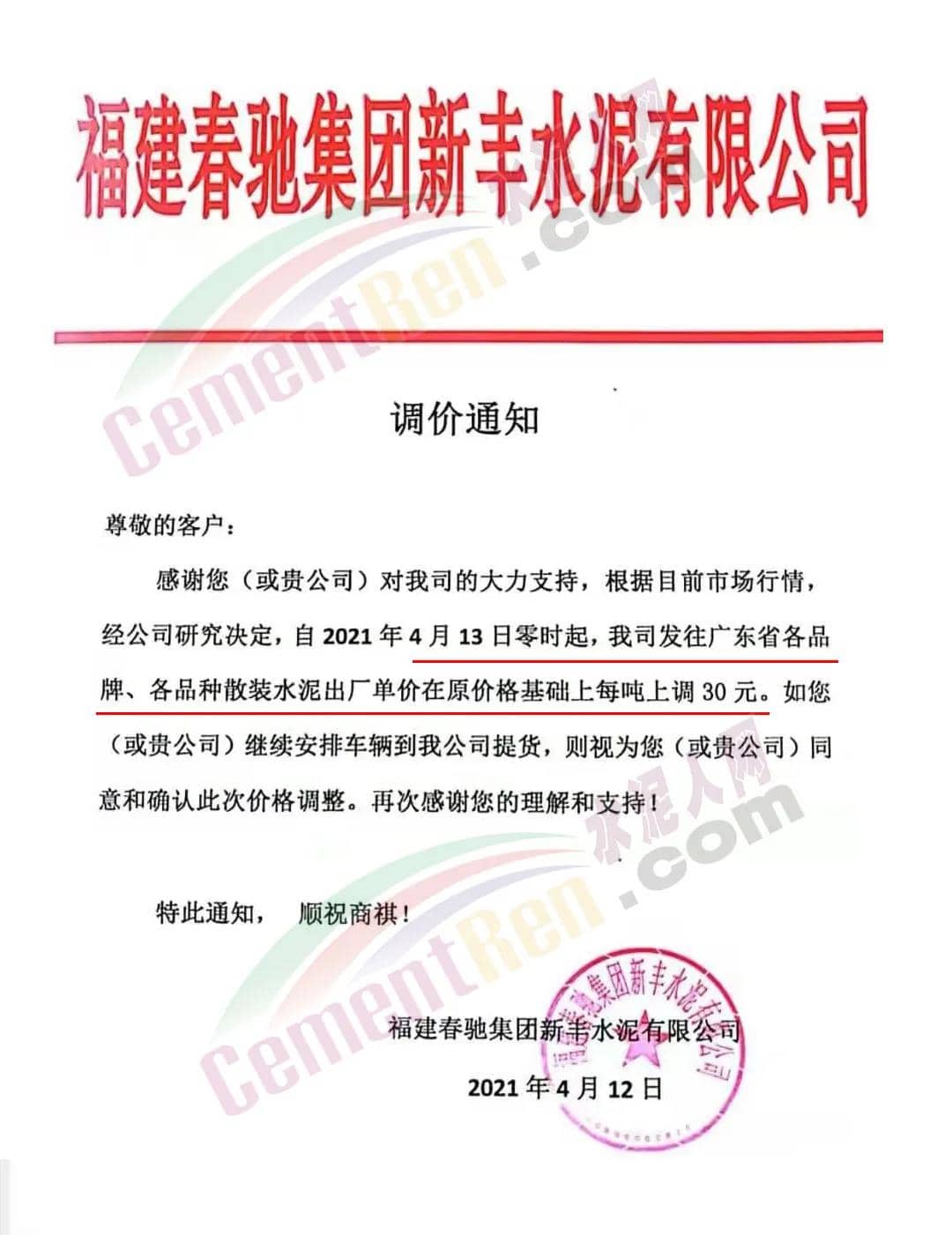 福建春馳集團新豐水泥有限公司通知自4月13日零時起,發(fā)往廣東省各品牌、各品種散裝水泥出廠單價在原價格基礎(chǔ)上上調(diào)30元/噸。