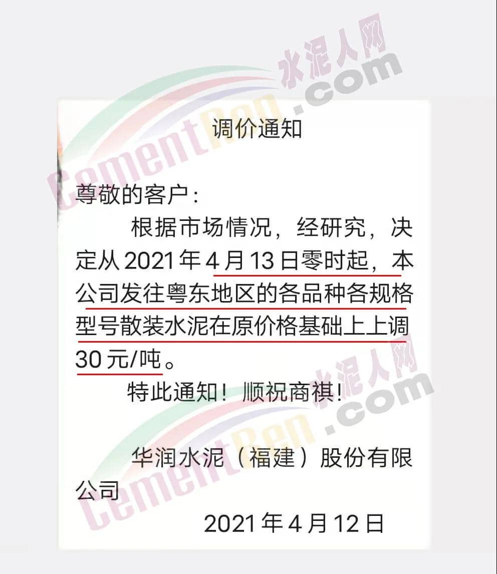 華潤水泥(福建)股份有限公司通知從4月13日零時起,公司發(fā)往粵東地區(qū)的各品種各規(guī)格型號散裝水泥在原價格基礎(chǔ)上上調(diào)30元/噸。
