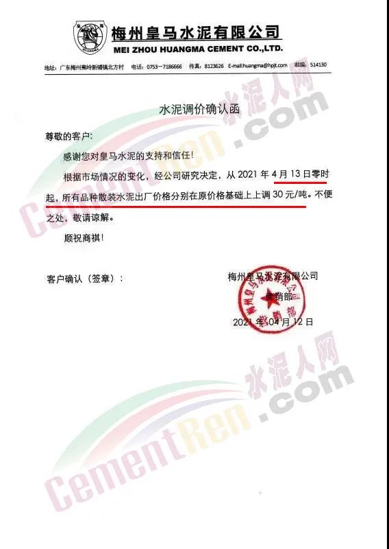 梅州皇馬水泥有限公司從4月13日零時起,所有品種散裝水泥出廠價格分別在原價格基礎(chǔ)上上調(diào)30元/噸。