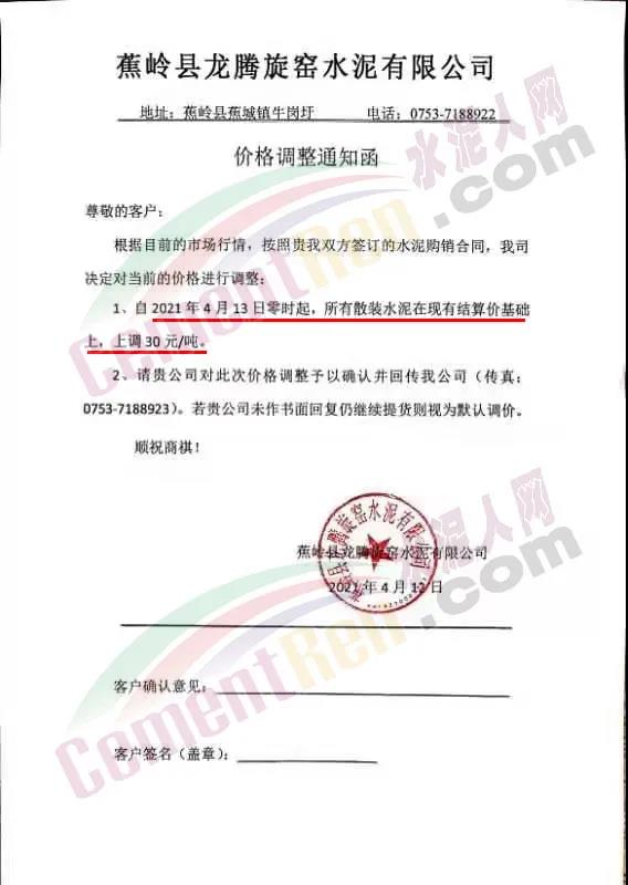 蕉嶺縣龍騰旋窯水泥有限公司通知自4月13日零時起,所有散裝水泥在現(xiàn)有結(jié)算價基礎(chǔ)上,上調(diào)30元/噸。