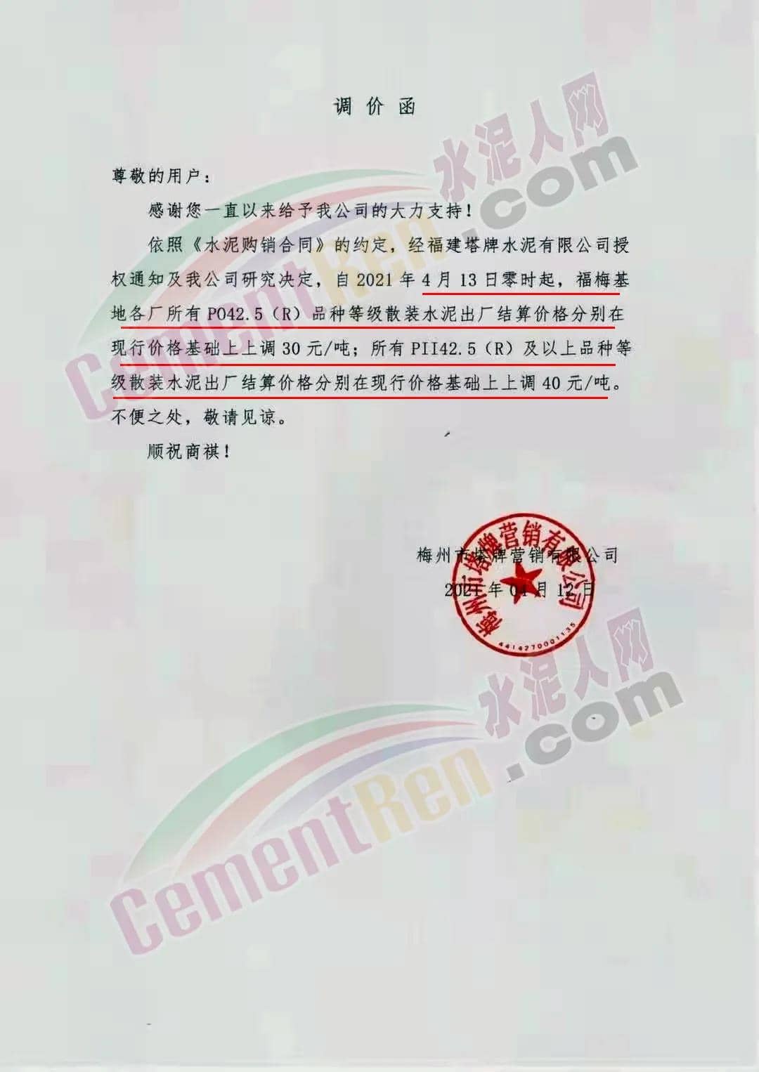 梅州市塔牌營銷有限公司通知,經(jīng)福建塔牌水泥有限公司授權(quán)通知及公司研究決定,自4月13日零時起,福梅基地各廠所有PO42.5(R)品種等級散裝水泥出廠結(jié)算價格分別在現(xiàn)行價格基礎(chǔ)上上調(diào)30元/噸;所有 PII42.5(R)及以上品種等級散裝水泥出廠結(jié)算價格分別在現(xiàn)行價格基礎(chǔ)上上調(diào)40元/噸。