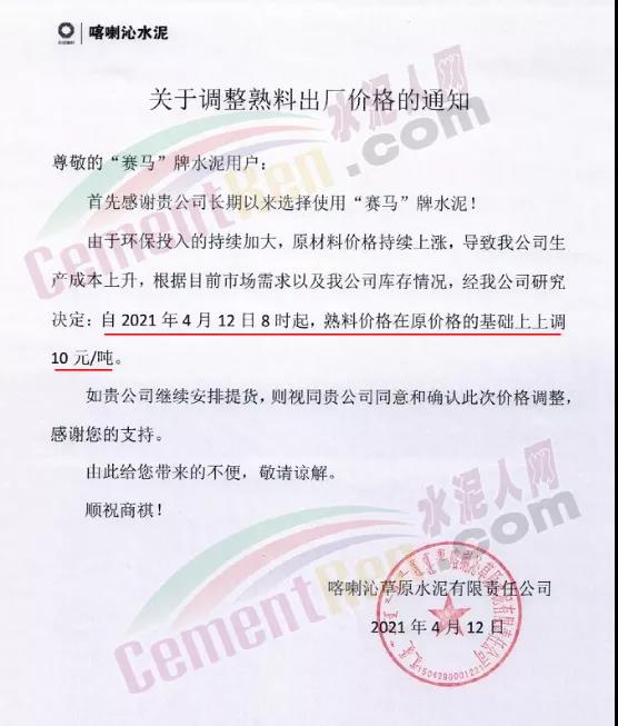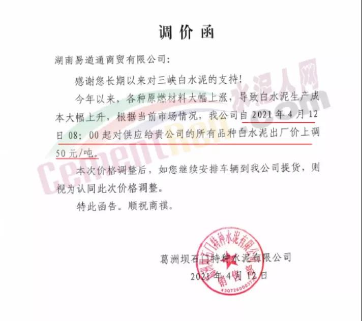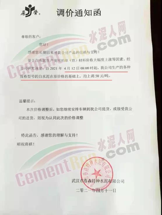 武漢市春森特種水泥有限公司通知,鑒于白水泥生產(chǎn)使用的原(燃)材料價格大幅度上漲等因素。經(jīng)公司研究決定,自4月12日8時起,公司生產(chǎn)的各種規(guī)格型號的白水泥在原價格的基礎(chǔ)上,均上調(diào)50元/噸。