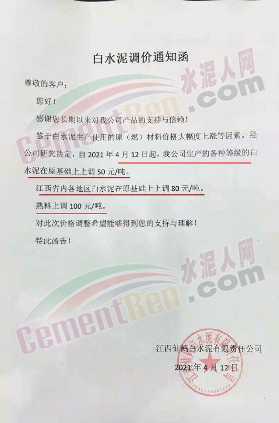 江西仙鶴白水泥有限責(zé)任公司通知鑒于白水泥生產(chǎn)使用的原(燃)材料價格大幅度上漲等因素。經(jīng)公司研究決定,自4月12日起,公司生產(chǎn)的各種等級的白水泥在原基礎(chǔ)上上調(diào)50元/噸。江西省內(nèi)各地區(qū)白水泥在原基礎(chǔ)上上調(diào) 80元/噸,熟料上調(diào)100元/噸。
