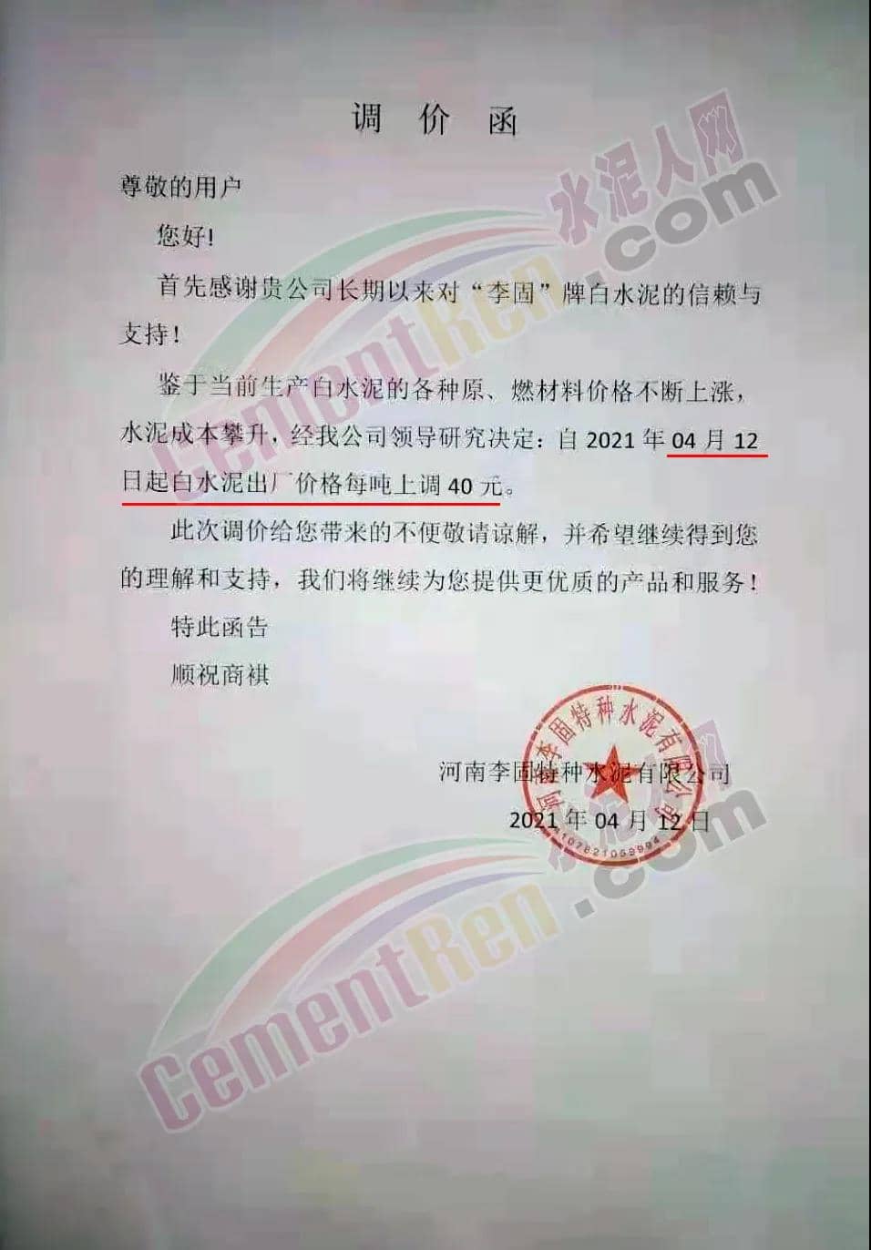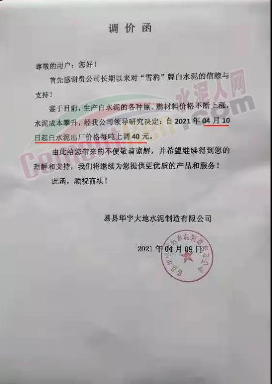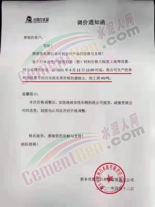 河南李固特種水泥有限公司通知,鑒于當(dāng)前生產(chǎn)白水泥的各種原、燃材料價格不斷上漲,水泥成本攀升,經(jīng)公司領(lǐng)導(dǎo)研究決定,自2021年4月12日起白水泥出廠價格上調(diào)40元/噸。