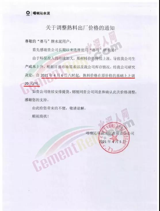 與此同時,多家特種水泥企業(yè)通知上調(diào)產(chǎn)品價格,其中白水泥價格上調(diào)30-100元/噸,熟料上漲100元/噸。
