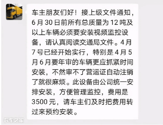 根據(jù)規(guī)定,為重卡加裝視頻監(jiān)控是免費(fèi)的,但是,陸續(xù)有卡友反饋,車隊(duì)喊他們?nèi)パb視頻監(jiān)控,需要卡友們自己付費(fèi),金額在3000元左右,不裝的話,以后車輛年審就過不了。這里就出現(xiàn)了一個(gè)問題,到底是誰在收費(fèi)?