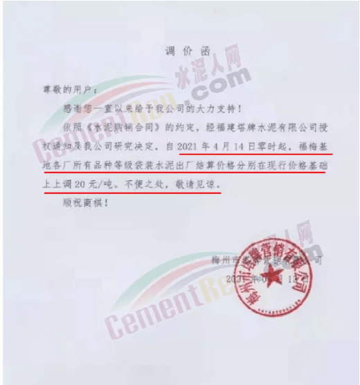 根據(jù)當前市場行情,我公司于2021年4月14日8:00時,對M32.5級袋裝、PO42.5級袋裝水泥上調(diào)20元/噸,特此通知!