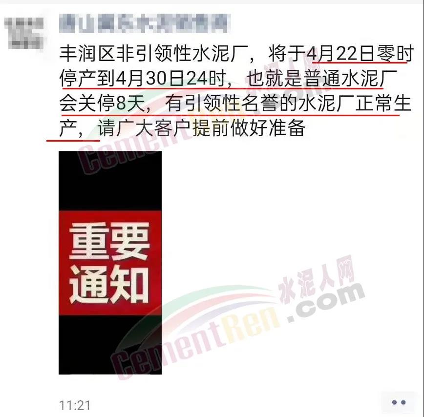 水泥人網(wǎng)通訊員消息:日前,河北唐山豐潤區(qū)水泥經(jīng)銷商通知,“豐潤區(qū)非引領(lǐng)性水泥廠,將于4月22日零時停產(chǎn)到4月30日24時,也就是普通水泥廠會關(guān)停8天,有引領(lǐng)性名譽的水泥廠正常生產(chǎn)”。同時,區(qū)域內(nèi)部分企業(yè)已經(jīng)率先通知上調(diào)水泥價格。