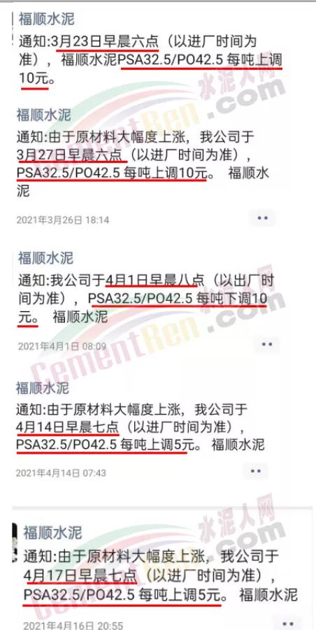 福順?biāo)嗤ㄖ?由于原材料大幅度上漲,公司于4月17日早七點,PSA32.5/PO42.5上調(diào)5元/噸。據(jù)水泥人網(wǎng)了解,自3月下旬開始福順?biāo)嘁讯啻紊险{(diào)水泥價格,累計上調(diào)40元/噸。
