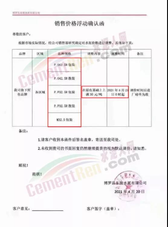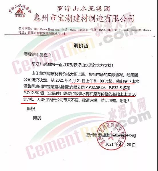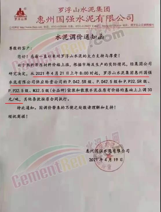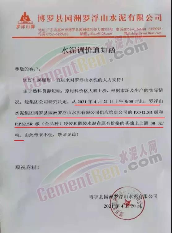 博羅縣園洲羅浮山水泥有限公司羅浮山牌通知由于熟料貨源短缺,原材料價格大幅上漲,根據(jù)市場及生產(chǎn)的實際情況,經(jīng)集團公司研究決定,從4月21日上午8時起,公司P.O42.5R級和P.P32.5R級(全品種)袋裝和散裝水泥在原有價格的基礎(chǔ)上上調(diào)30元/噸。