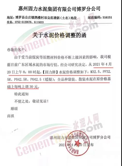惠州固力水泥集團有限公司通知,由于受當(dāng)前煤炭等原燃材料價格不斷上漲因素的影響,經(jīng)公司研究決定,從4月20日上午8時起,“固力牌”水泥M32.5、PP32.5R、PO42.5R、PO42.5(緩凝),全品種袋裝、散裝水泥在原價格基礎(chǔ)上每噸上調(diào)30元。