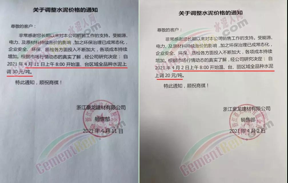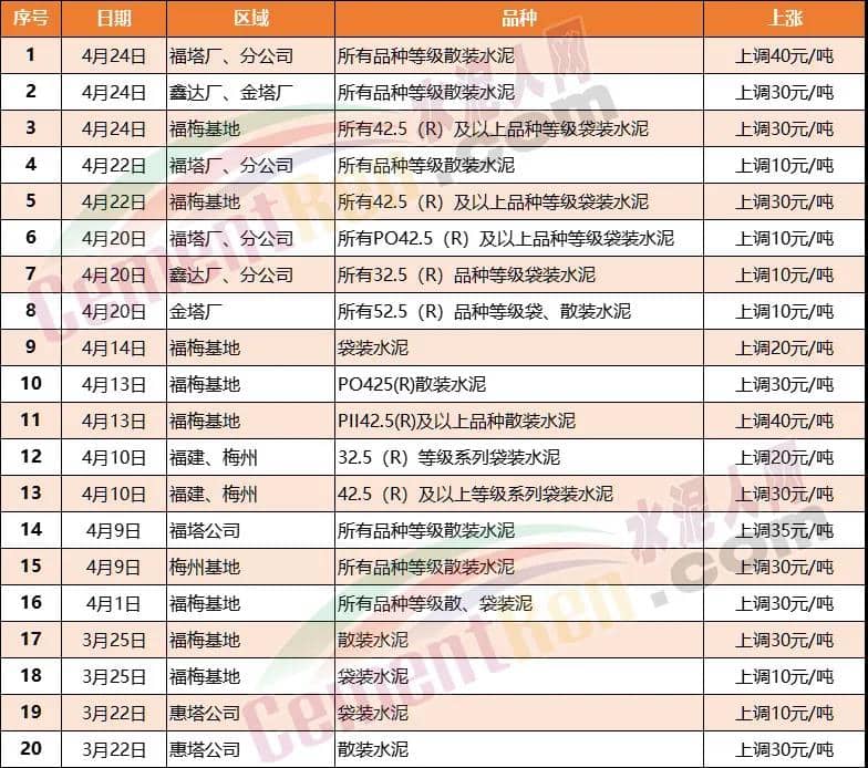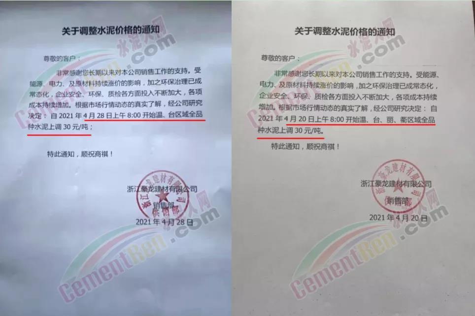 4月20日上午8∶00開始溫、臺、麗、衢區(qū)域全品種水泥上調(diào)30元/噸。