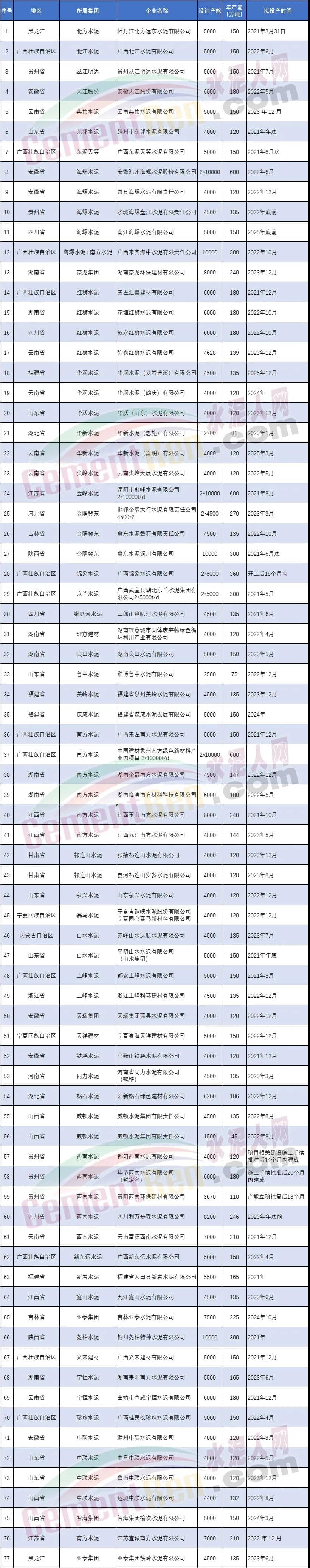 中國(guó)建材集團(tuán)南方水泥、西南水泥、中聯(lián)水泥、北方水泥、祁連山、賽馬水泥等多家企業(yè)目前在建擬建生產(chǎn)線共22條熟料生產(chǎn)線,合計(jì)產(chǎn)能達(dá)3539萬(wàn)噸。