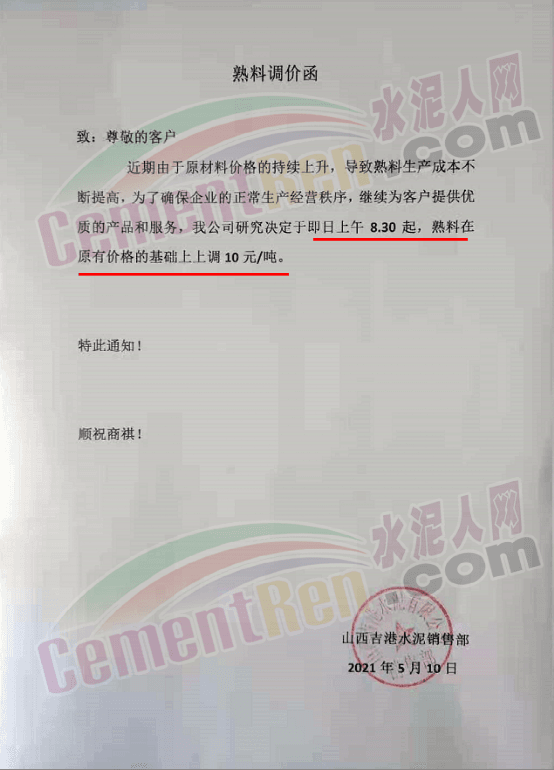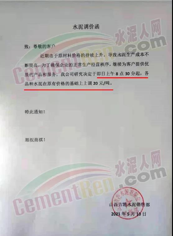 水泥人網(wǎng)通訊員消息,近幾日華北地區(qū)多家企業(yè)通知上調(diào)水泥價(jià)格,5月10日山西吉港水泥連發(fā)兩份調(diào)價(jià)函通知水泥漲20元/噸,熟料漲10元/噸。