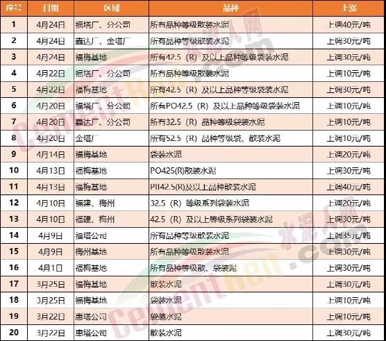 四月初福建三明、南平、龍巖、寧德、南平、泉州、廈門、漳州、莆田、閩南、龍巖等地區(qū)塔牌水泥、臺(tái)泥水泥、華潤(rùn)水泥、紅獅水泥、福建春馳等陸續(xù)通知上調(diào)30-55元/噸。同時(shí)外發(fā)廣東區(qū)域的水泥價(jià)格隨廣東區(qū)域價(jià)格上調(diào)而上漲。