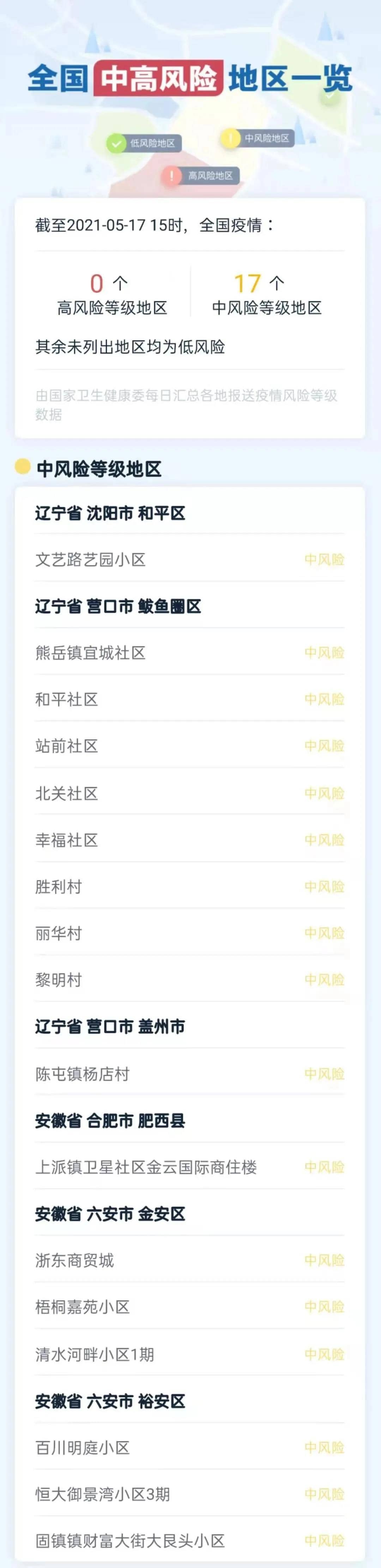 截止5月17日11時(shí),全國(guó)中風(fēng)險(xiǎn)地區(qū)已經(jīng)增至17個(gè),安徽省7個(gè),遼寧省10個(gè)。