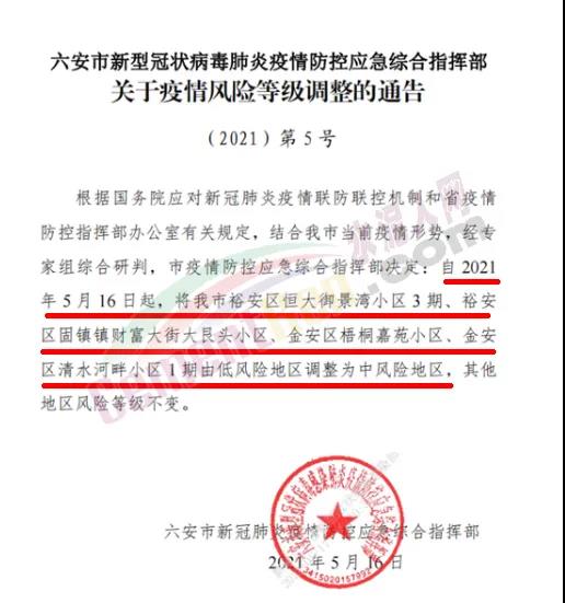 5月16日,安徽省六安市新型冠狀病毒肺炎疫情防控應(yīng)急綜合指揮部發(fā)布《關(guān)于疫情風(fēng)險(xiǎn)等級(jí)調(diào)整的通告》稱(chēng),根據(jù)國(guó)務(wù)院應(yīng)對(duì)新冠肺炎疫情聯(lián)防聯(lián)控機(jī)制和省疫情防控指揮部辦公室有關(guān)規(guī)定,結(jié)合六安市當(dāng)前疫情形勢(shì),經(jīng)專(zhuān)家組綜合研判,市疫情防控應(yīng)急綜合指揮部決定∶自 2021年5月16日起,將六安市裕安區(qū)恒大御景灣小區(qū)3期、裕安區(qū)固鎮(zhèn)鎮(zhèn)財(cái)富大街大艮頭小區(qū)、金安區(qū)梧桐嘉苑小區(qū)、金安區(qū)清水河畔小區(qū)1期由低風(fēng)險(xiǎn)地區(qū)調(diào)整為中風(fēng)險(xiǎn)地區(qū),其他地區(qū)風(fēng)險(xiǎn)等級(jí)不變。