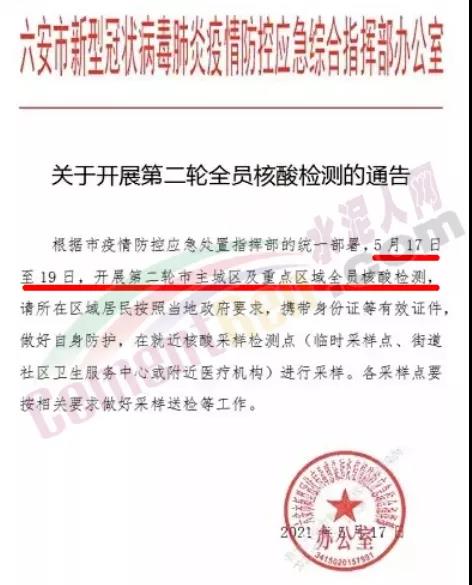 17日六安市發(fā)布《關(guān)于第二輪全員核酸檢測(cè)的通告》
