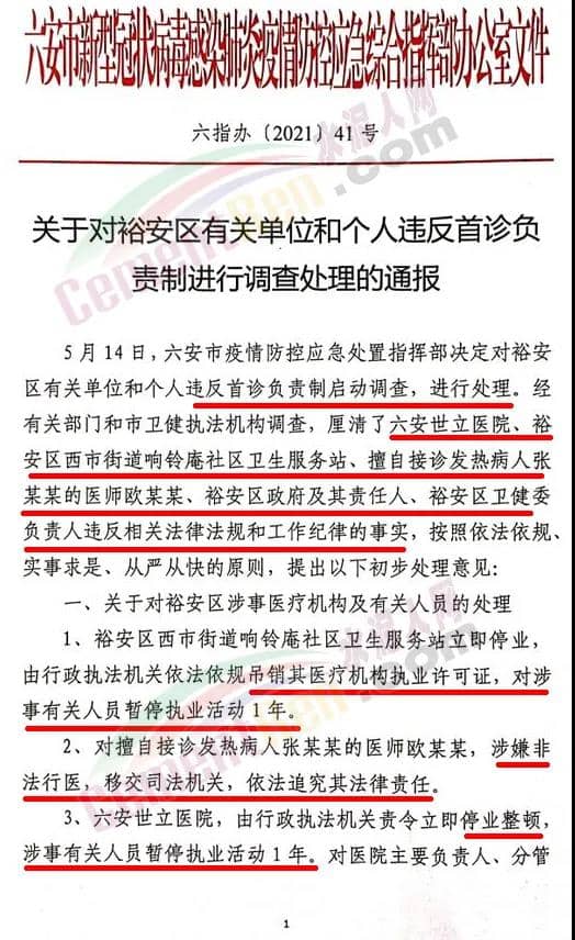 5月16日,安徽六安裕安區(qū)有關(guān)單位和個(gè)人因違反首診負(fù)責(zé)制,多人被問(wèn)責(zé),其中包括:對(duì)擅自接診發(fā)熱病人張某某的醫(yī)師歐某某,涉嫌非法行醫(yī),移交司法機(jī)關(guān),依法追究其法律責(zé)任;責(zé)成裕安區(qū)對(duì)區(qū)衛(wèi)健委主要負(fù)責(zé)人、分管負(fù)責(zé)人,立即停職,接受進(jìn)一步調(diào)查處理等。