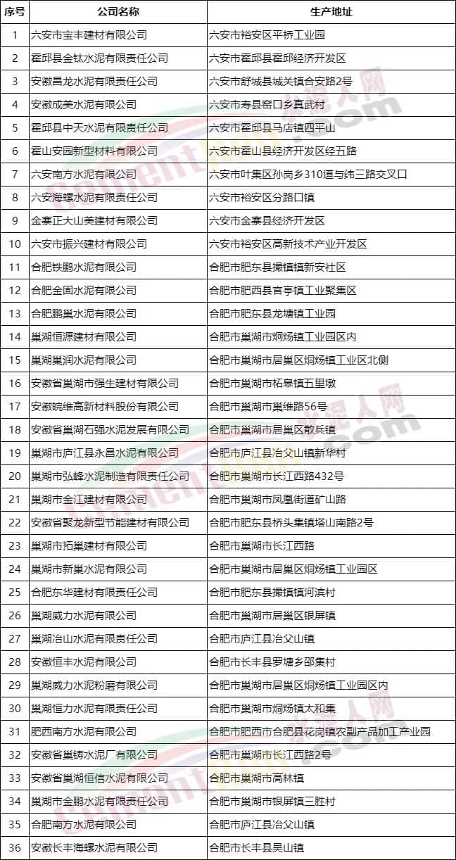 安徽合肥、六安兩市水泥企業(yè)名單