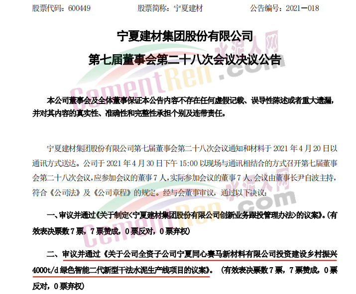 近日,寧夏建材公布公司第七屆董事會第二十八次會議決議,審議并通過關(guān)于公司全資子公司寧夏同心賽馬新材料有限公司投資建設(shè)鄉(xiāng)村振興4000t/d綠色智能二代新型干法水泥生產(chǎn)線項(xiàng)目的議案。一條年產(chǎn)124萬噸的智能化水泥熟料生產(chǎn)線將開建!