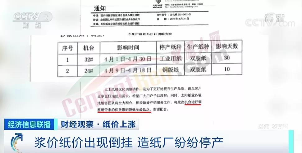 與此同時(shí),“紙廠紛紛停產(chǎn)”也沖上微博熱搜。山東太陽(yáng)集團(tuán)宣布,4月份對(duì)工業(yè)用紙和銅板紙紙機(jī)進(jìn)行優(yōu)化調(diào)整;山東華泰紙業(yè)發(fā)布通知,計(jì)劃5月上旬對(duì)銅板紙紙機(jī)停產(chǎn)維保;晨鳴紙業(yè)決定于5月中上旬對(duì)文化紙機(jī)臺(tái)停機(jī)檢修10天。