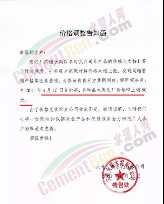 日前,大連天瑞水泥有限公司通知稱,鑒于目前原煤、礦粉等大宗原材料價(jià)格大幅上漲,交通運(yùn)輸管制嚴(yán)格等因素影響,經(jīng)研究決定自6月15日8時(shí)起,各品種水泥出廠價(jià)上調(diào)50元/噸。