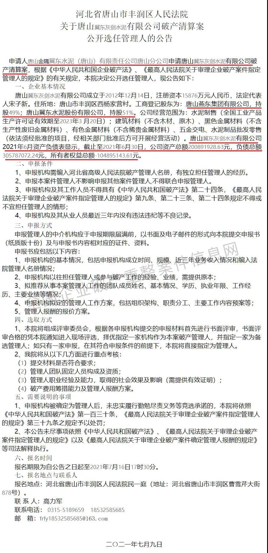 (一)7月9日河北省唐山市豐潤區(qū)人民法院發(fā)布公告稱,唐山金隅冀東水泥(唐山)公司唐山分公司申請?zhí)粕郊綎|灰劍水泥有限公司破產(chǎn)清算案,將公開選任管理人。