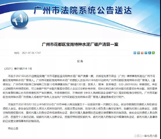7月6日廣州市法院發(fā)布公告稱已于6月25日裁定受理廣州市花都區(qū)寶崗特種水泥廠破產(chǎn)清算一案,并指定北京市君合(廣州)律師事務所擔任廣州市花都區(qū)寶崗特種水泥廠管理人。債權(quán)人需在8月10日前向廣州市花都區(qū)寶崗特種水泥廠管理人申報債權(quán)。