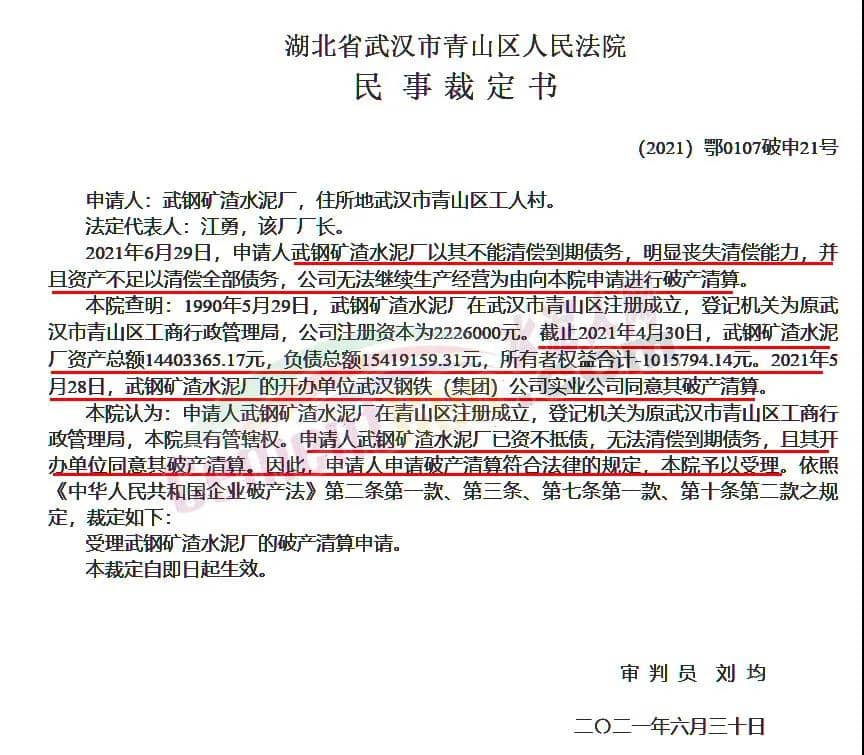 6月29日,申請人武鋼礦渣水泥廠以其不能清償?shù)狡趥鶆?,明顯喪失清償能力,并且資產(chǎn)不足以清償全部債務,公司無法繼續(xù)生產(chǎn)經(jīng)營為由向法院申請進行破產(chǎn)清算。截止2021年4月30日,武鋼礦渣水泥廠資產(chǎn)總額約1440萬,負債總額約1542萬元,所有者權(quán)益合計約-101.58萬元。2021年5月28日,武鋼礦渣水泥廠的開辦單位武漢鋼鐵(集團)公司實業(yè)公司同意其破產(chǎn)清算。