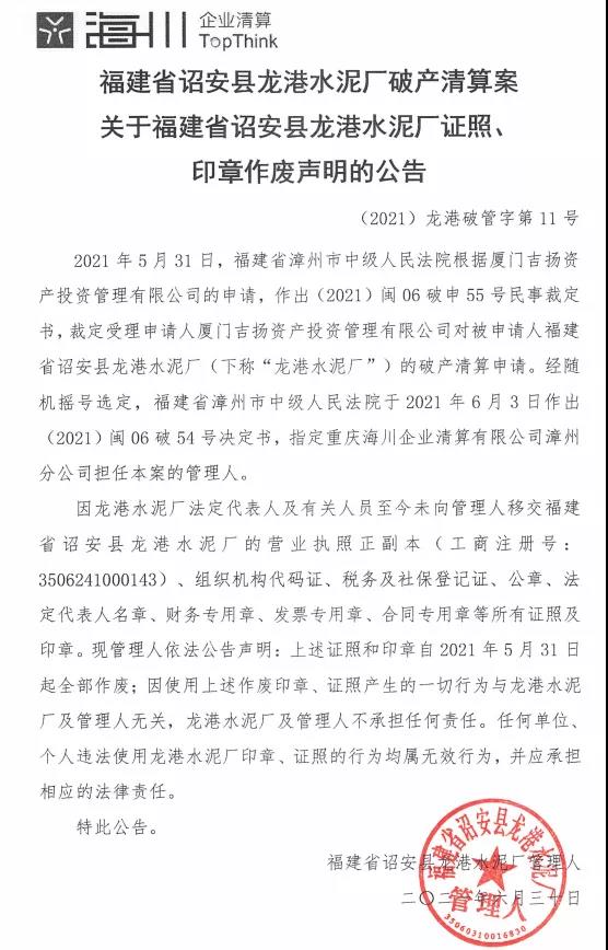 福建龍港水泥、江蘇運通水泥破產(chǎn)清算,證照、印章作廢