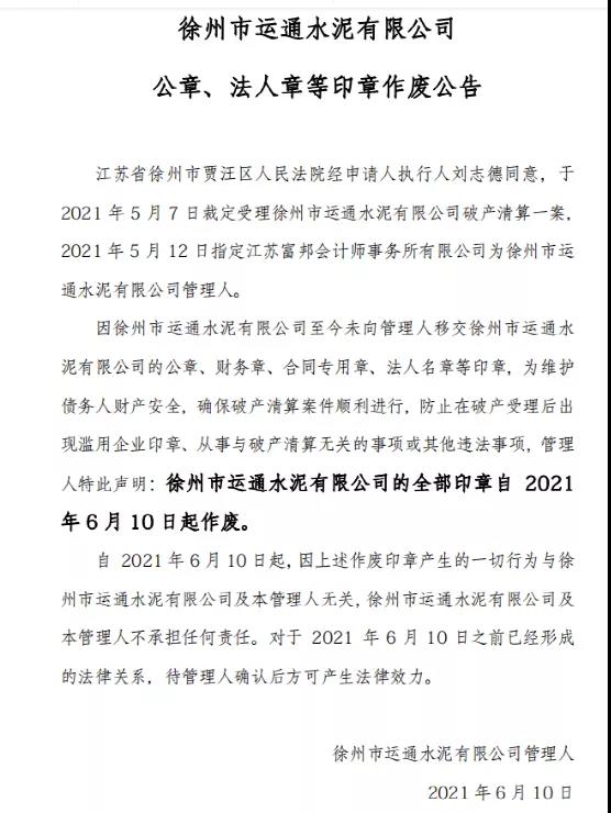 6月10日徐州市運通水泥有限公司管理人公告,江蘇省徐州市賈汪區(qū)人民法院經(jīng)申請人執(zhí)行人劉志德同意,于5月7日裁定受理徐州市運通水泥有限公司破產(chǎn)清算一案,并于5月12日指定江蘇富邦會計師事務所有限公司為徐州市運通水泥有限公司管理人。因徐州市運通水泥有限公司至今未向管理人移交徐州市運通水泥有限公司的相關(guān)證照和印章,管理人聲明徐州市運通水泥有限公司的全部印章作廢。