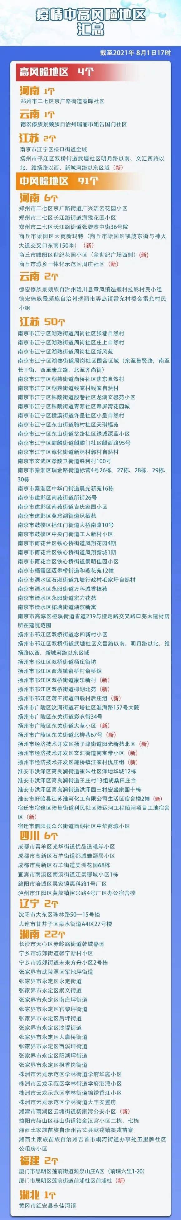 8月1日,據(jù)“揚州發(fā)布”微信公眾號消息,經(jīng)揚州市新冠肺炎疫情防控工作指揮部研究,自8月1日起,對揚州市部分區(qū)域疫情風險等級進行調(diào)整,揚州市邗江區(qū)雙橋街道武塘社區(qū)明月路以南、文匯西路以北、維揚路以西、新城河路以東區(qū)域由中風險地區(qū)調(diào)整為高風險地區(qū);揚州市廣陵區(qū)東關街道大草小區(qū);揚州市廣陵區(qū)東關街道北柳巷67號;揚州市邗江區(qū)雙橋街道康樂新村等8個小區(qū)為中風險地區(qū)。