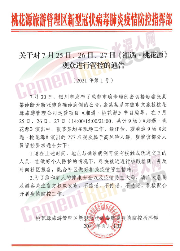 同日,湖南常德市桃花源旅游管理區(qū)新型冠狀病毒肺炎疫情防控指揮部發(fā)布消息稱,在7月25日、26日、27日觀看9場《湘遇·桃花源》演出的777名觀眾屬于高風險人群。