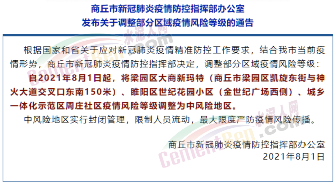 河南商丘市新冠肺炎疫情防控指揮部辦公室發(fā)布《商丘市新冠肺炎疫情防控指揮部辦公室發(fā)布關于調(diào)整部分區(qū)域疫情風險等級的通告》稱,自8月1日起,將梁園區(qū)大商新瑪特(商丘市梁園區(qū)凱旋東街與神火大道交叉口東南150米)、睢陽區(qū)世紀花園小區(qū)(金世紀廣場西側(cè))、城鄉(xiāng)一體化示范區(qū)周莊社區(qū)疫情風險等級調(diào)整為中風險地區(qū)。中風險地區(qū)實行封閉管理,限制人員流動,最大限度嚴防疫情風險傳播。