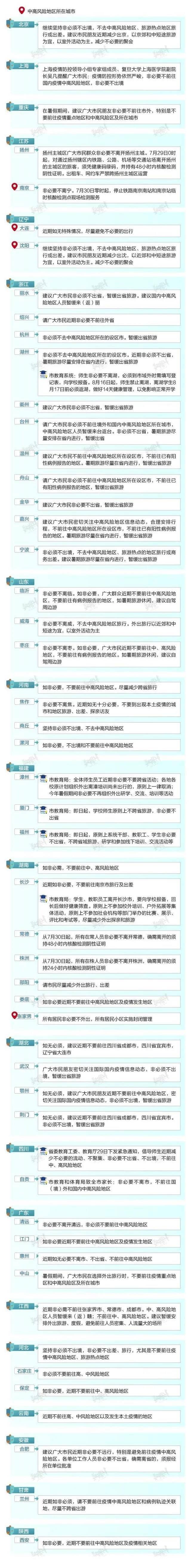 據(jù)不完全統(tǒng)計,截至7月30日18時,全國共有19個?。ㄗ灾螀^(qū)、直轄市)發(fā)布53條疫情防控出行提醒,涉及46個城市。其中,29個省市提醒市民“非必要不出省、不離市”或“減少出省、出市”,占全部出行提醒數(shù)量的5成以上。超7成省市提到"不去中高風險地區(qū)",有5成省市建議市民"暫緩出省旅游"或選擇“周邊游”。浙江、福建、湖南、四川I4省部分城市的教育系統(tǒng)均對暑期師生防疫工作提出嚴格要求,取消相關的外出交流、培訓活動。