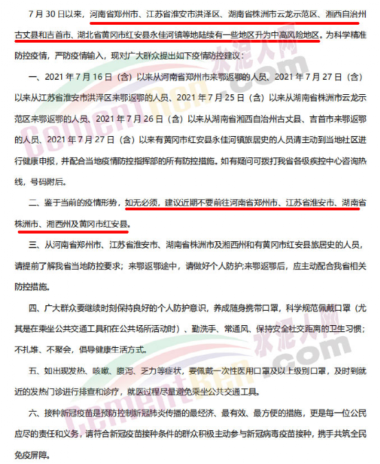 7月31日,湖北疾控連續(xù)發(fā)出多個緊急提示,鑒于當前的疫情形勢,如無必須,建議近期不要前往河南省鄭州市、江蘇省淮安市、湖南省株洲市、湘西州及黃岡市紅安縣。