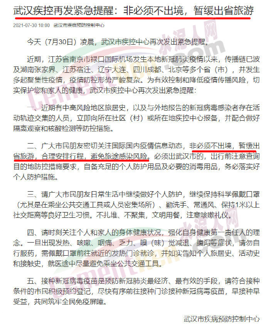 武漢疾控再發(fā)緊急提醒,非必須不出境,暫緩出省旅游。