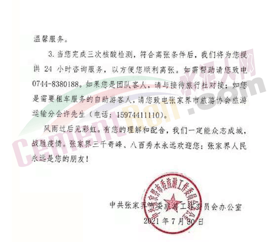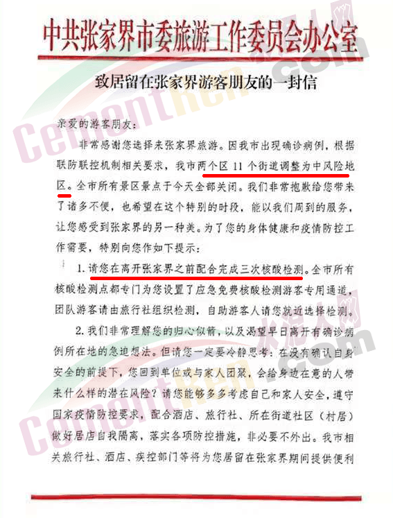 7月30日,湖南省張家界發(fā)布《致居留在張家界游客朋友的一封信》,稱根據(jù)聯(lián)防聯(lián)控機制相關要求,張家界兩個區(qū)11個街道調(diào)整為中風險地區(qū)。全市所有景區(qū)景點于今天全部關閉,提示游客在離開張家界之前配合完成三次核酸檢測。